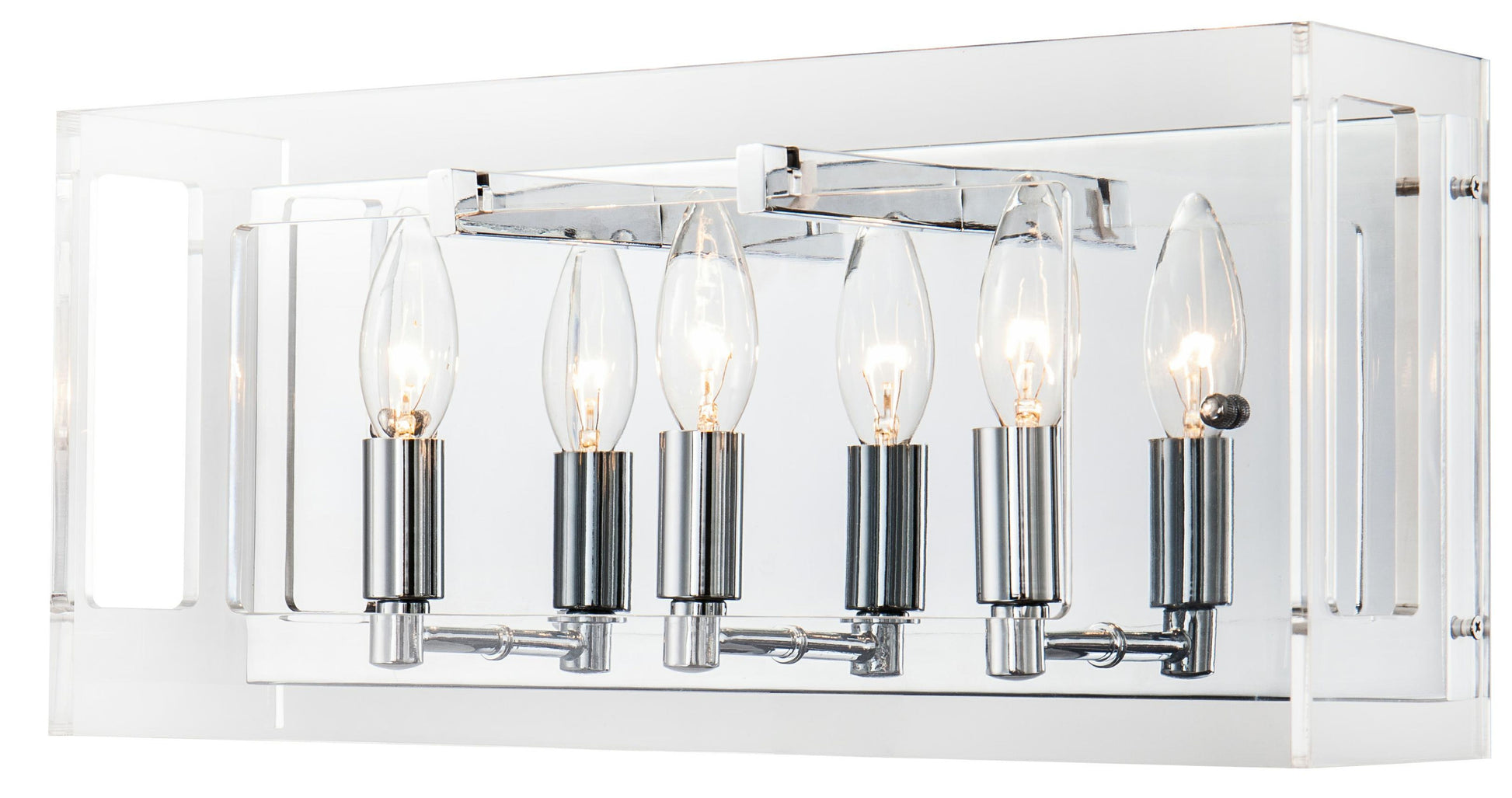 This exquisite wall sconce is in a chrome finish. The frame of the fixture is made out of acrylic and iron. It comes with boxed cut outs, and provides better illumination.