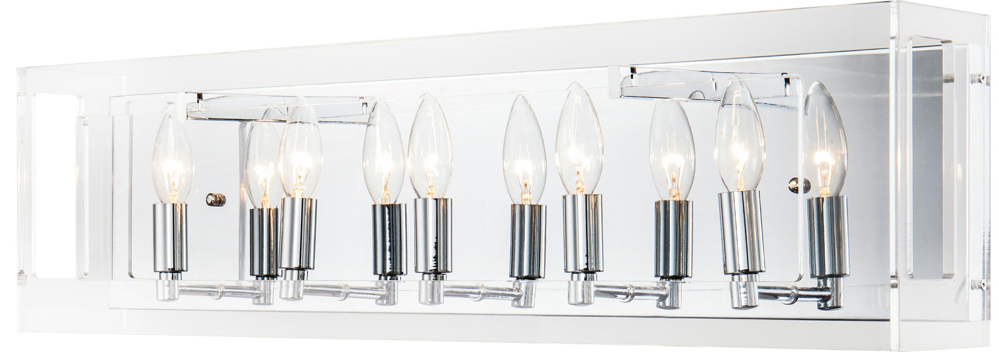 This exquisite wall sconce is in a chrome finish. The frame of the fixture is made out of acrylic and iron. It comes with boxed cut outs, and provides better illumination.