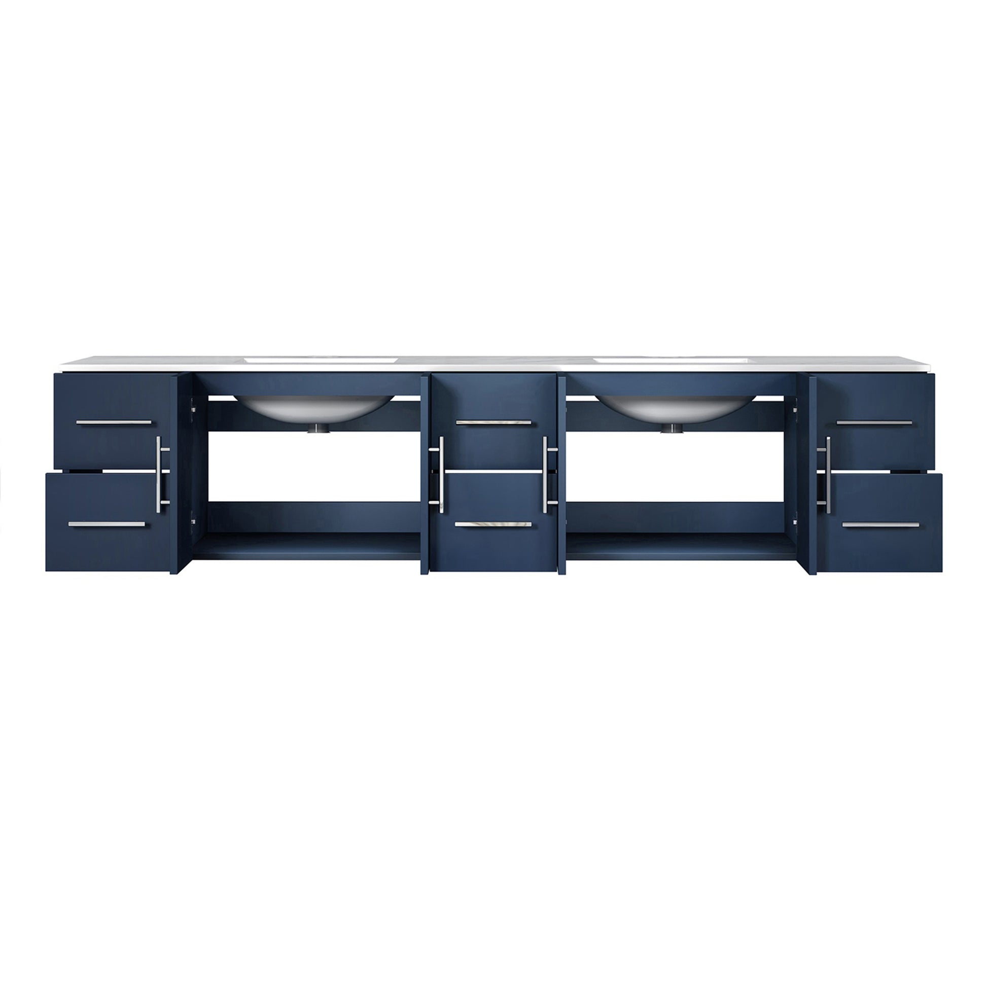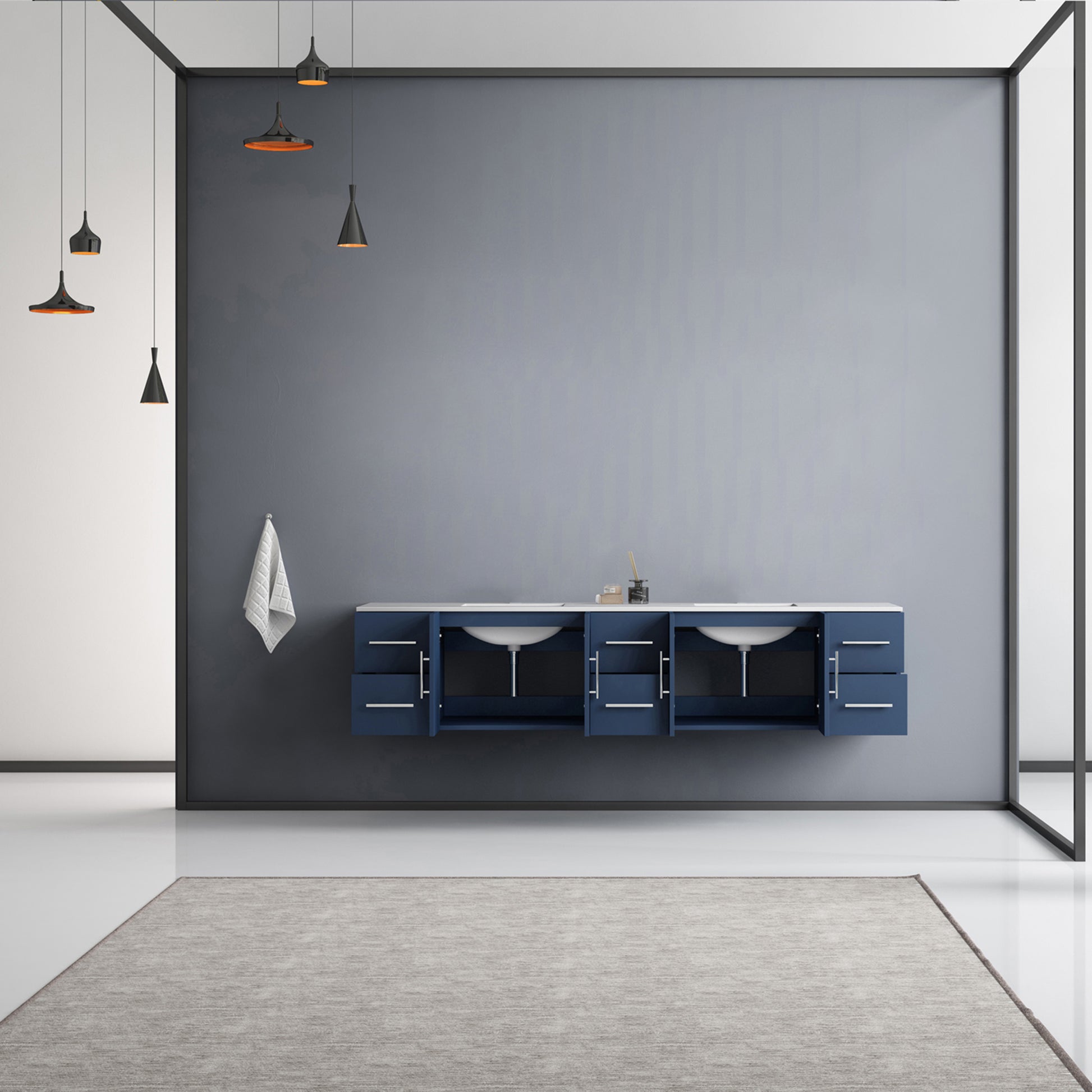 The wall-mounted Geneva vanity in navy blue from Lexora is a beautiful blending of postmodern style and sensible functionality. Its simple, box-like design is complemented by a countertop that lends hints of classical style. When mounted on the wall, the Geneva vanity leaves ample space beneath for additional storage-ideal for bathrooms with limited space. Available in different colors, you can easily match this vanity to any bathroom décor. This piece is all you need to give your bathroom a total makeover.
