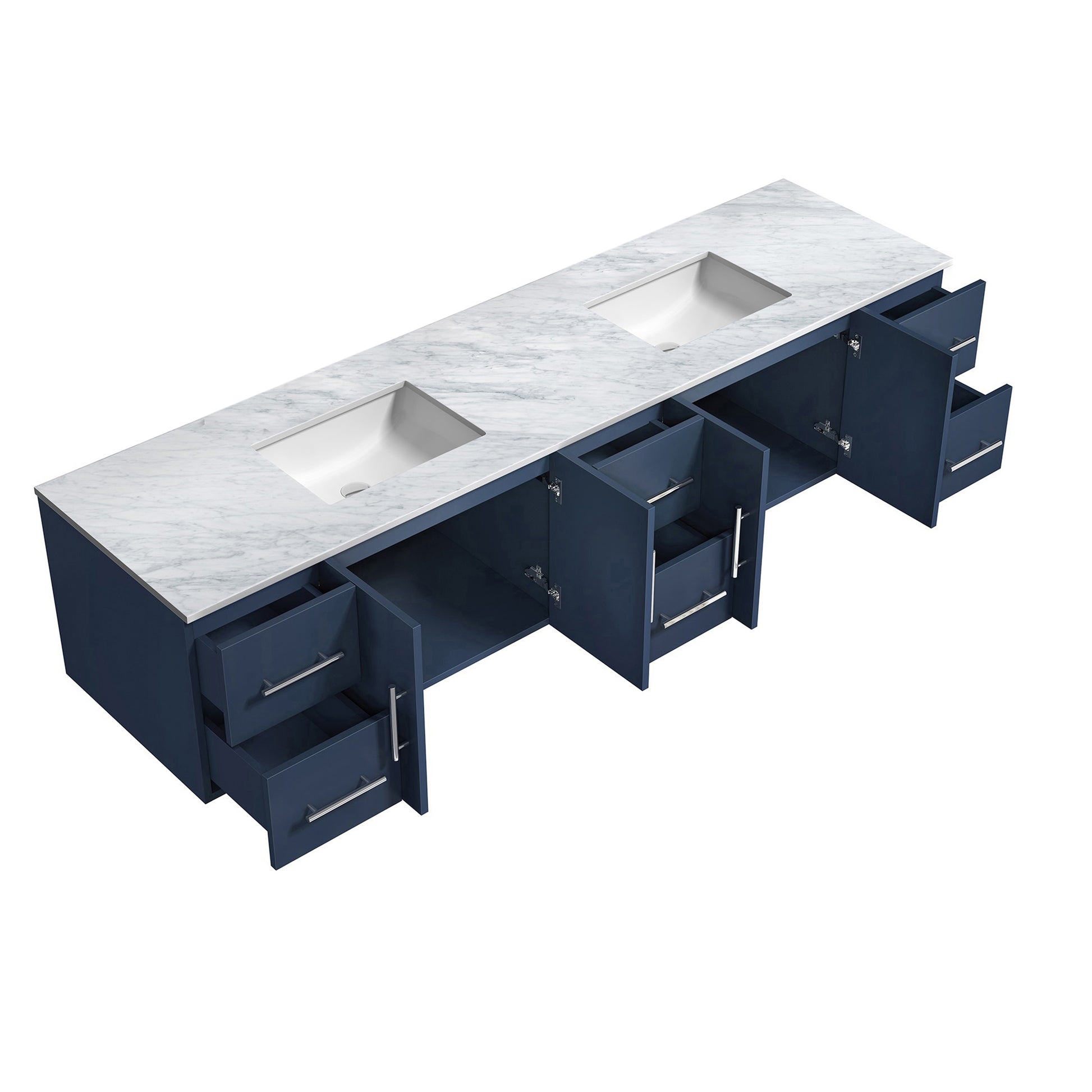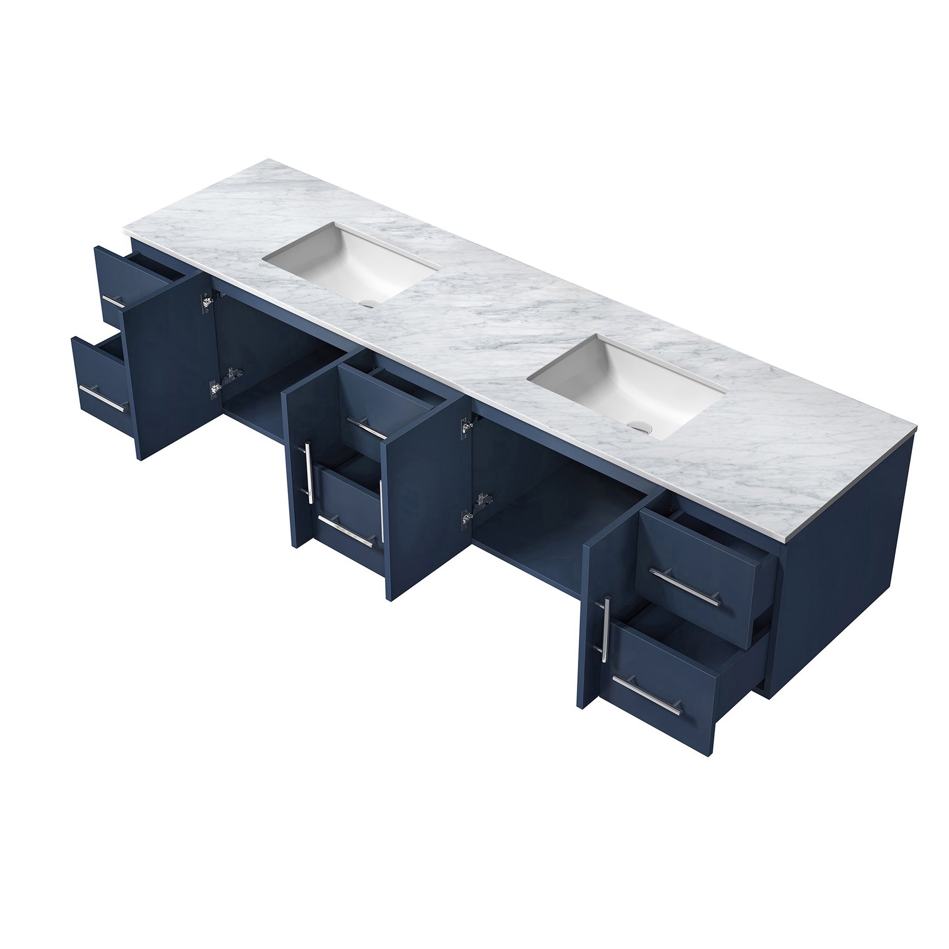 Geneva 84" Navy Blue Double Vanity, White Carrara Marble Top, White Square Sinks and no Mirror