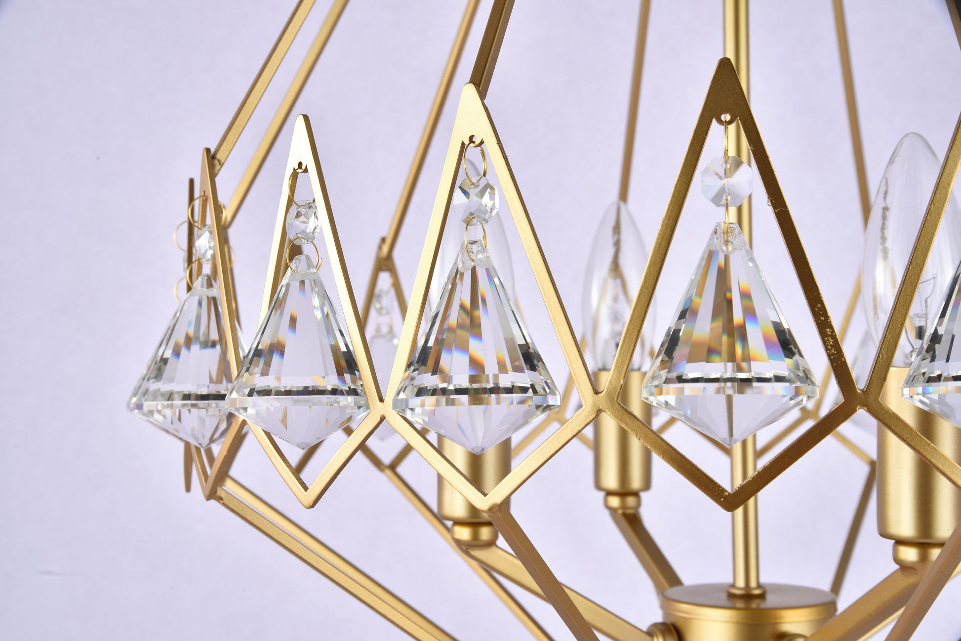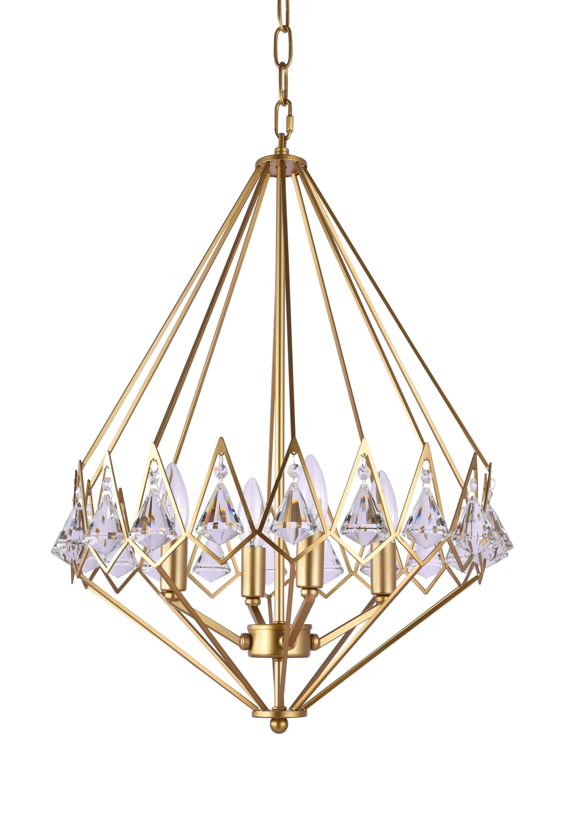 This chandelier is in a gold finish. The shape of this fixture looks like a diamond. It comes with crystal accents in clear color..