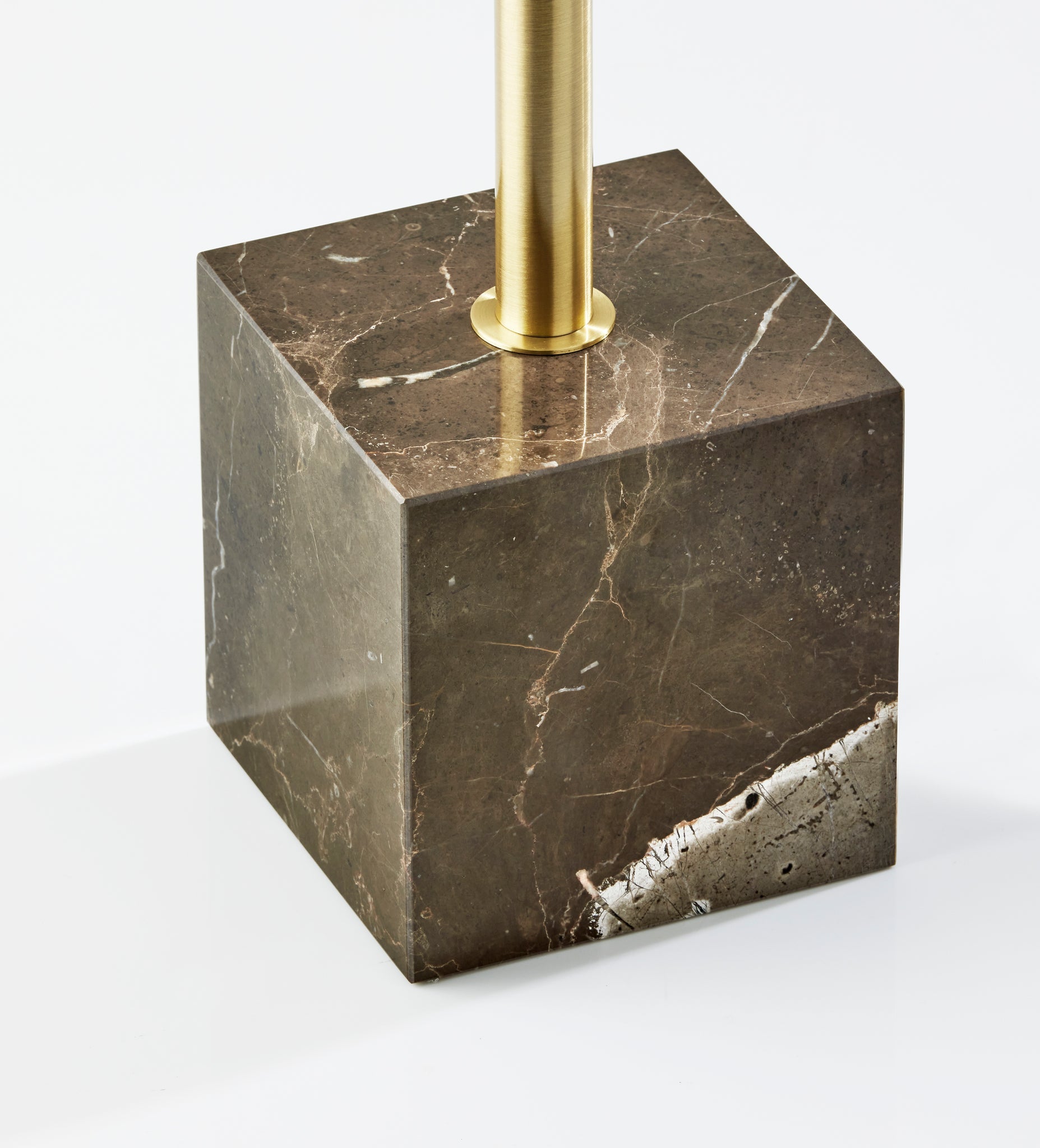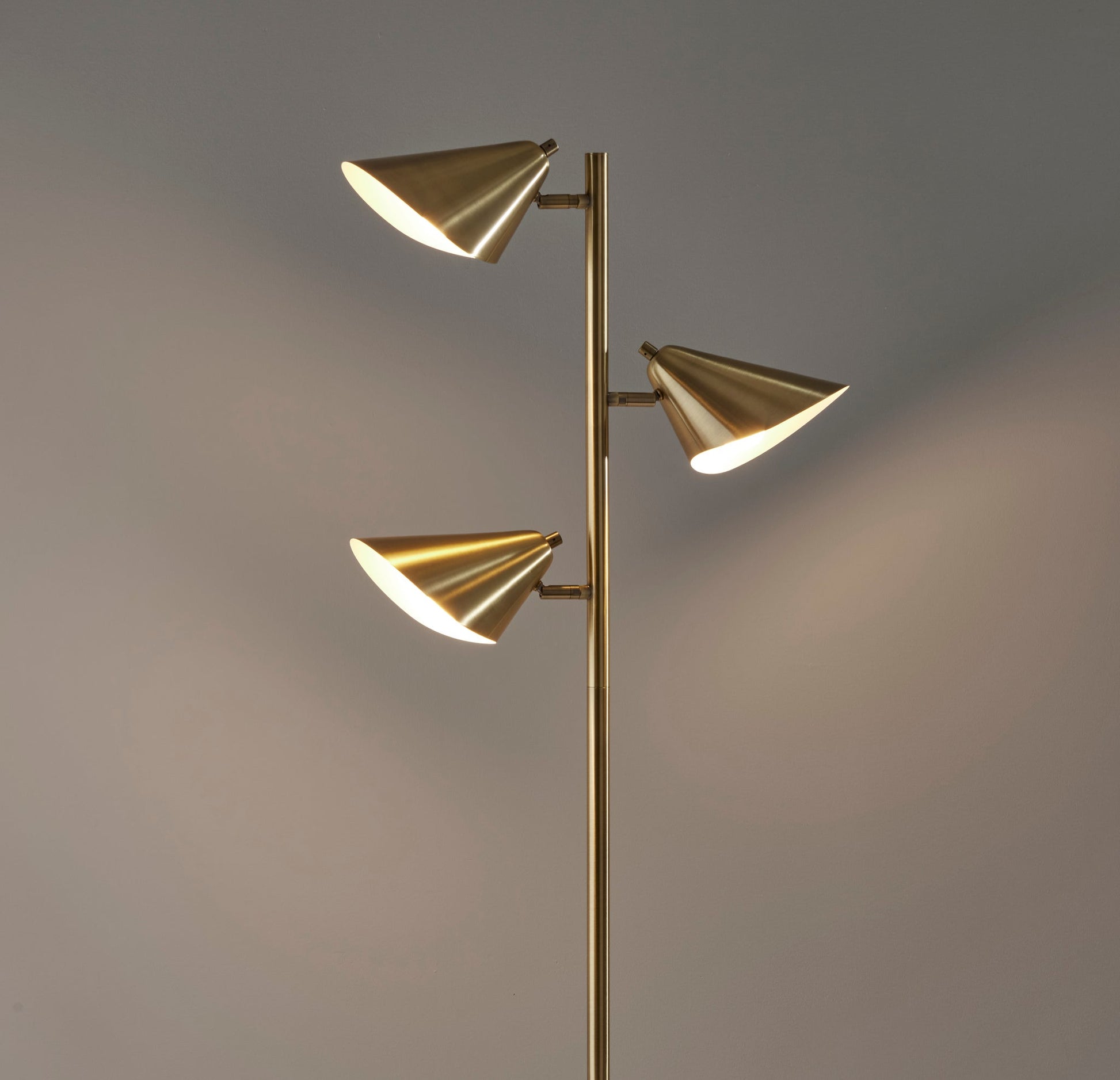 Bring mid-century modern style to your space with the Hawthorne tree lamp. Featuring a chunky cube-shaped base made of brown marble anchoring an antique brass pedestal and three offset shades, this floor lamp is both sleek and refined. And at 68 tall and a mere 8 deep, it is compact enough to be used in any area. It offers an articulation point at the joint of each curved cone-shaped shade, allowing you to direct the light wherever it's needed. Operated by a rotary switch located on each of the three shades to easily turn the 40W bulbs (not included) on or off, this lamp also features a 5' clear cord. Complete your space's look with the coordinating Hawthorne desk lamp and Hawthorne floor lamp.