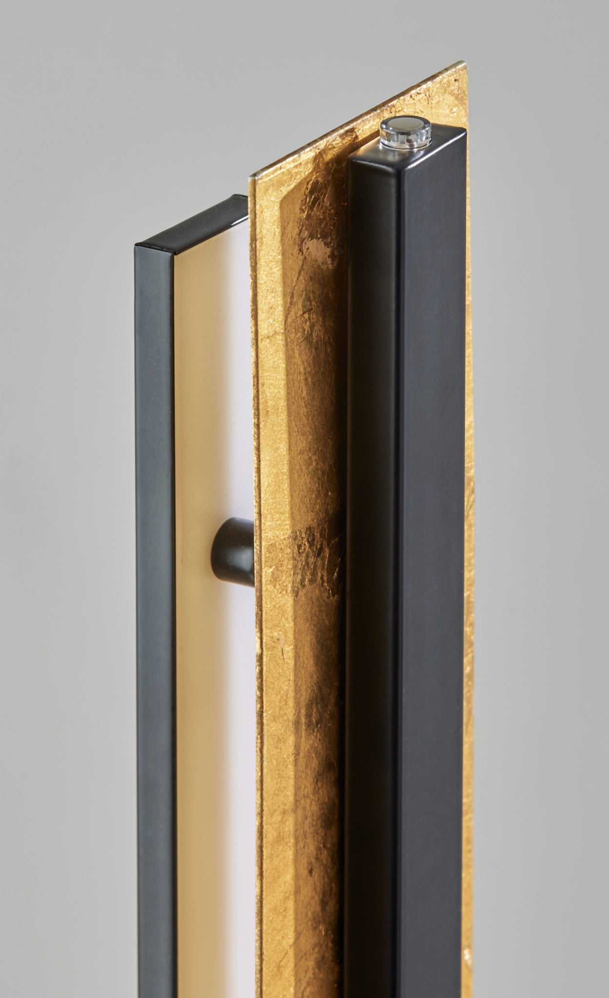 Bring a warm artistic glow to your space with the Hayden LED floor lamp. Its rectangular architecture along with a black metal and distinctive gold foil finish create a striking and dramatic look. The 52 tall and 9 wide lamp features a black metal rectangular body with two integrated 15W LED lights. Softly distilling the 1,800 lumens is a large rectangular gold foil diffuser that offsets the black metal finish. Operated by a three-step touch dimmer switch discretely positioned on the back, the brightness can easily be set to high, medium, low, or off to suit your needs. The lamp rests upon a low-profile, 9 square metal base with black finish and features a ?5-foot? black cord. Complete your space's look with the coordinating Hayden table lamp.