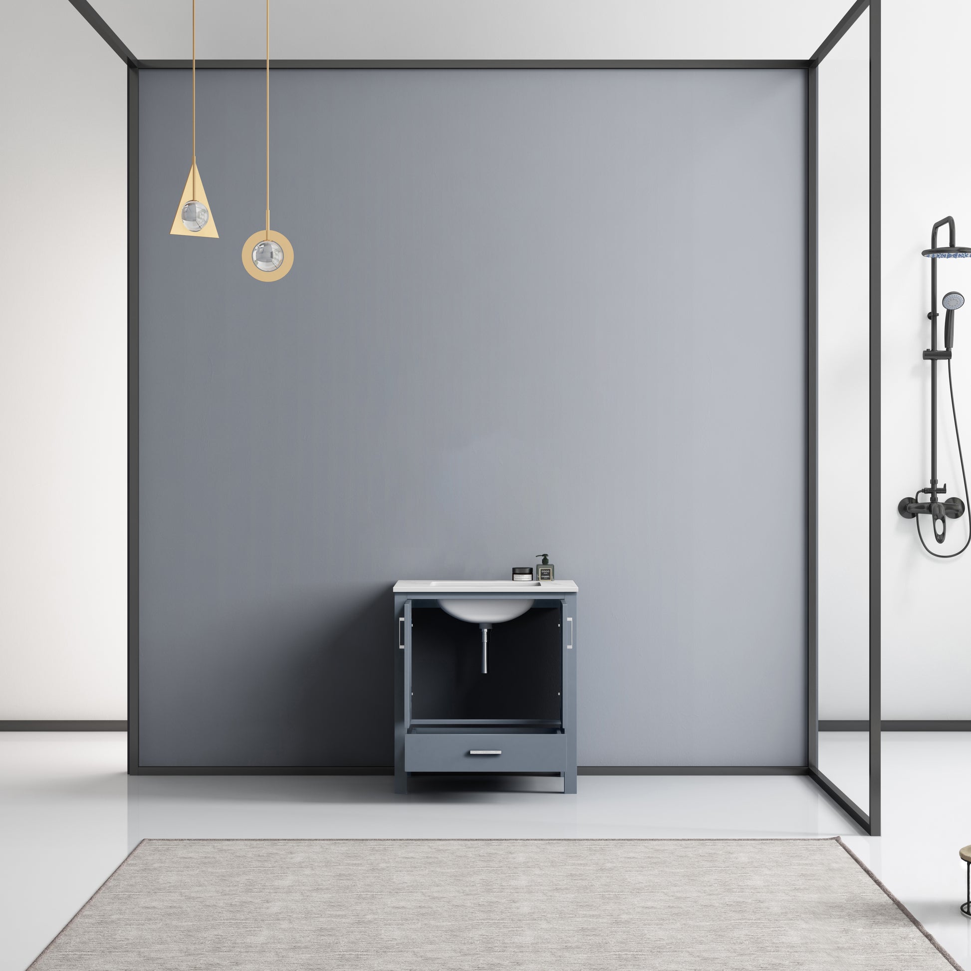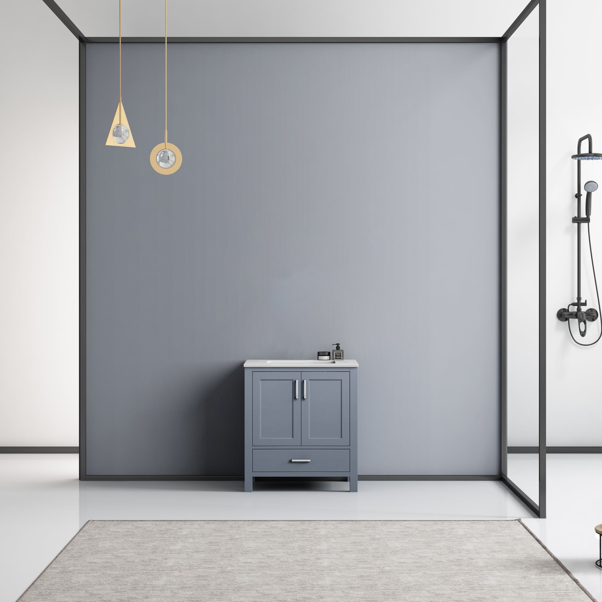 The Jacques vanity in dark grey from Lexora provides a beautiful, contemporary style to any bathroom. With sleek, clean lines and a cool, neutral finish, this vanity's beauty is only matched by its seamless functionality. The cabinet door and drawers feature soft-close hinges and slides to increase safety and ensure you never have to hear a slamming cabinet again. With solid birch and rubber wood construction, this piece is as durable as it is stunning. The Jacques vanity comes in different sizes and finishes to fit into any size bathroom and blends with any style. It also includes a matching stone countertop and ceramic undermount sink, making it the one package you need to finish off your bathroom upgrade.