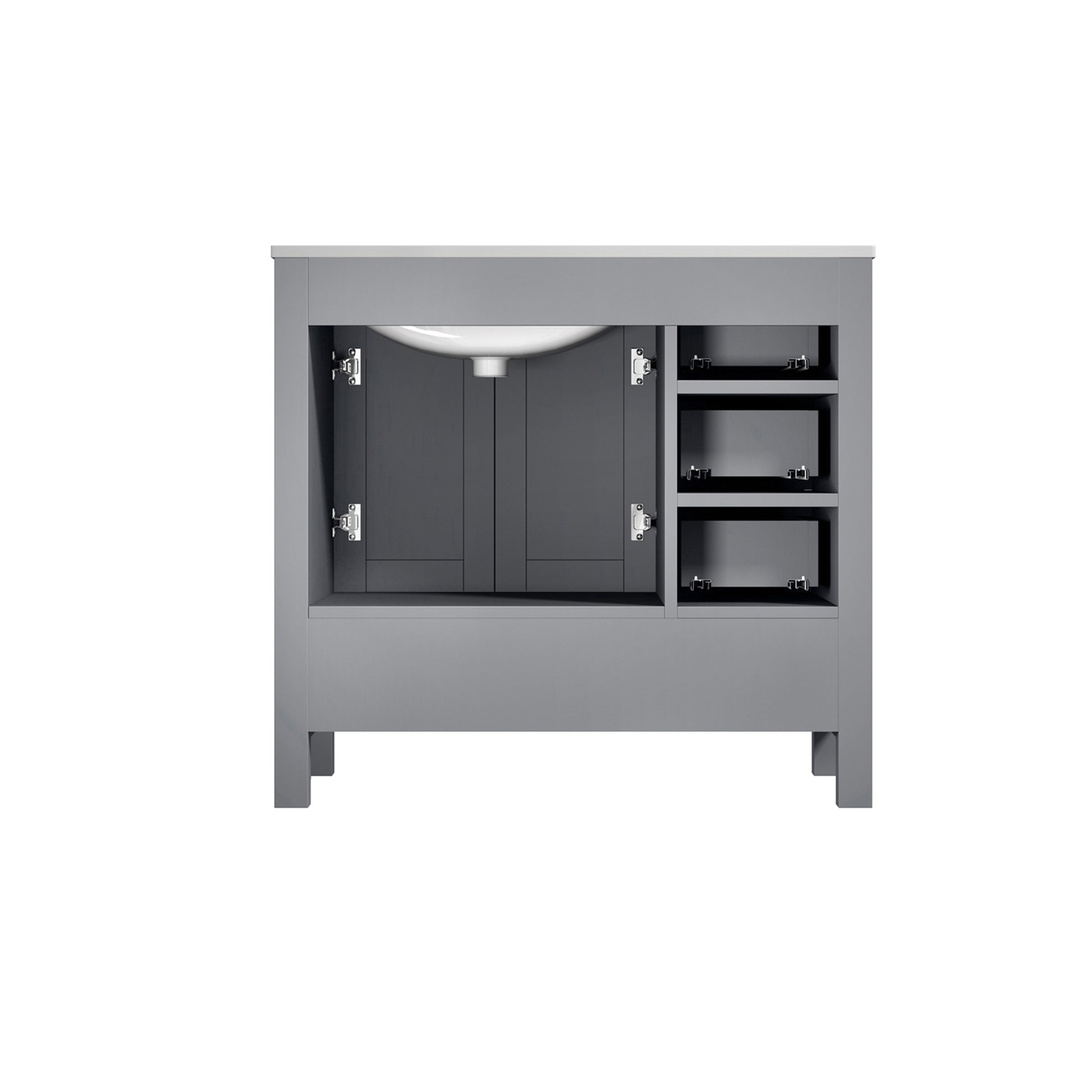 Jacques 36" Distressed Grey Single Vanity, White Carrara Marble Top, White Square Sink and 34" Mirror - Right Version