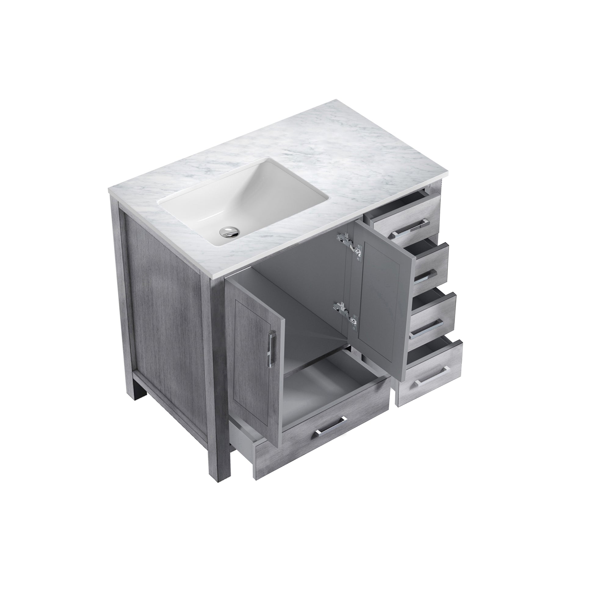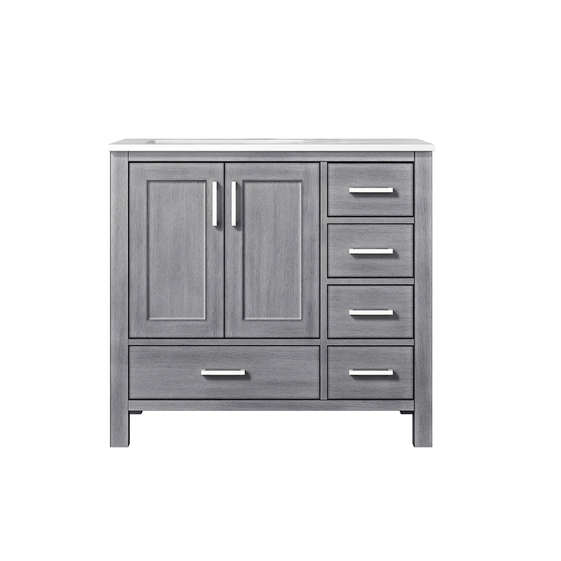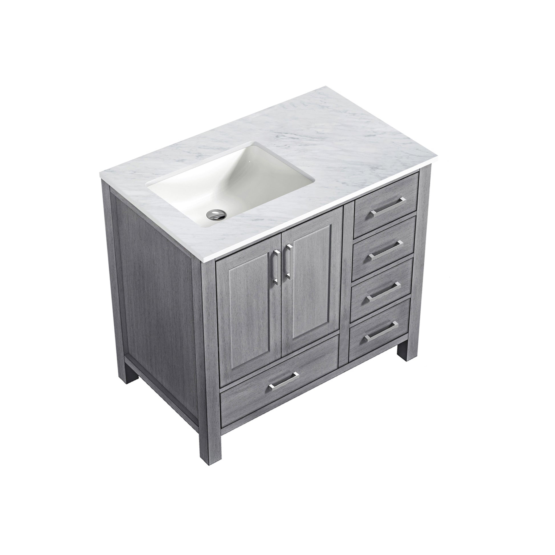 Jacques 36" Distressed Grey Single Vanity, White Carrara Marble Top, White Square Sink and no Mirror - Left Version