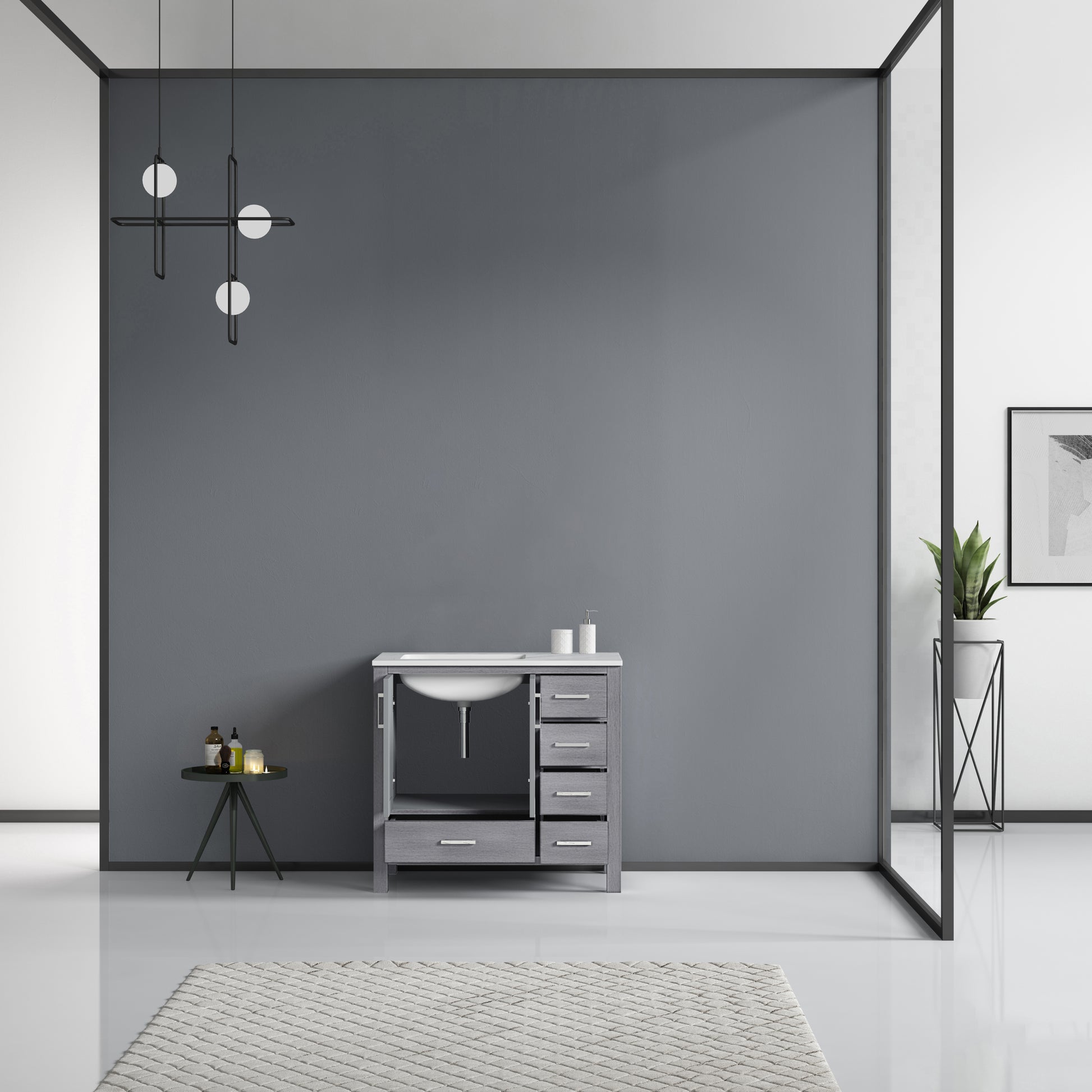 The Jacques vanity in distressed grey from Lexora provides a beautiful, contemporary style to any bathroom. With sleek, clean lines and a cool, neutral finish, this vanity's beauty is only matched by its seamless functionality. The cabinet doors and drawers feature soft-close hinges and slides to increase safety and ensure you never have to hear a slamming cabinet again. With solid birch and rubber wood construction, this piece is as durable as it is stunning. The Jacques vanity comes in different sizes and finishes to fit into any size bathroom and blends with any style. It also includes a matching countertop and ceramic undermount sink, making it the one package you need to finish off your bathroom upgrade.