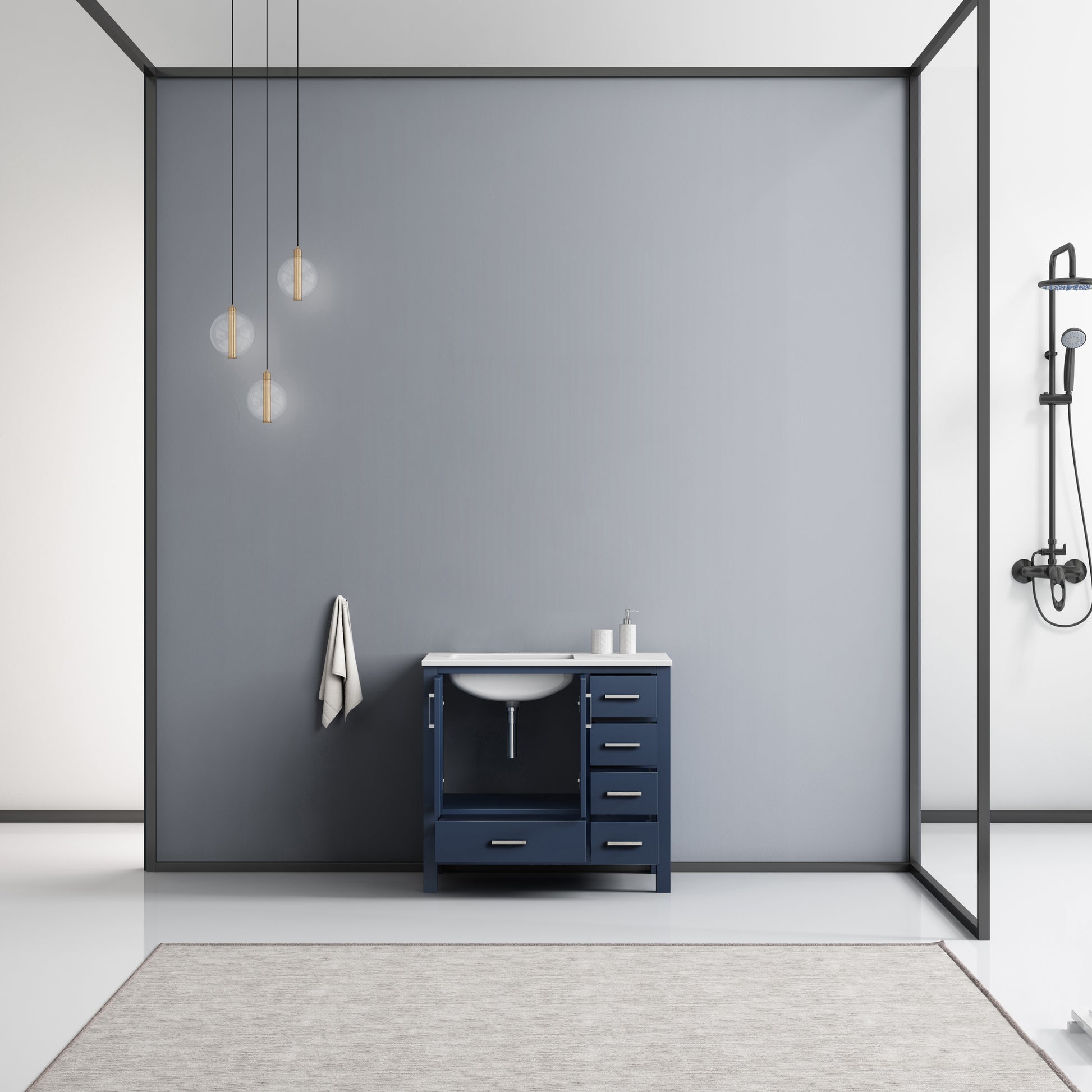 The Jacques vanity in navy blue from Lexora provides a beautiful, contemporary style to any bathroom. With sleek, clean lines and a cool, neutral finish, this vanity's beauty is only matched by its seamless functionality. The cabinet doors and drawers feature soft-close hinges and slides to increase safety and ensure you never have to hear a slamming cabinet again. With solid birch and rubber wood construction, this piece is as durable as it is stunning. The Jacques vanity comes in different sizes and finishes to fit into any size bathroom and blends with any style. It also includes a matching countertop and ceramic undermount sink, making it the one package you need to finish off your bathroom upgrade.