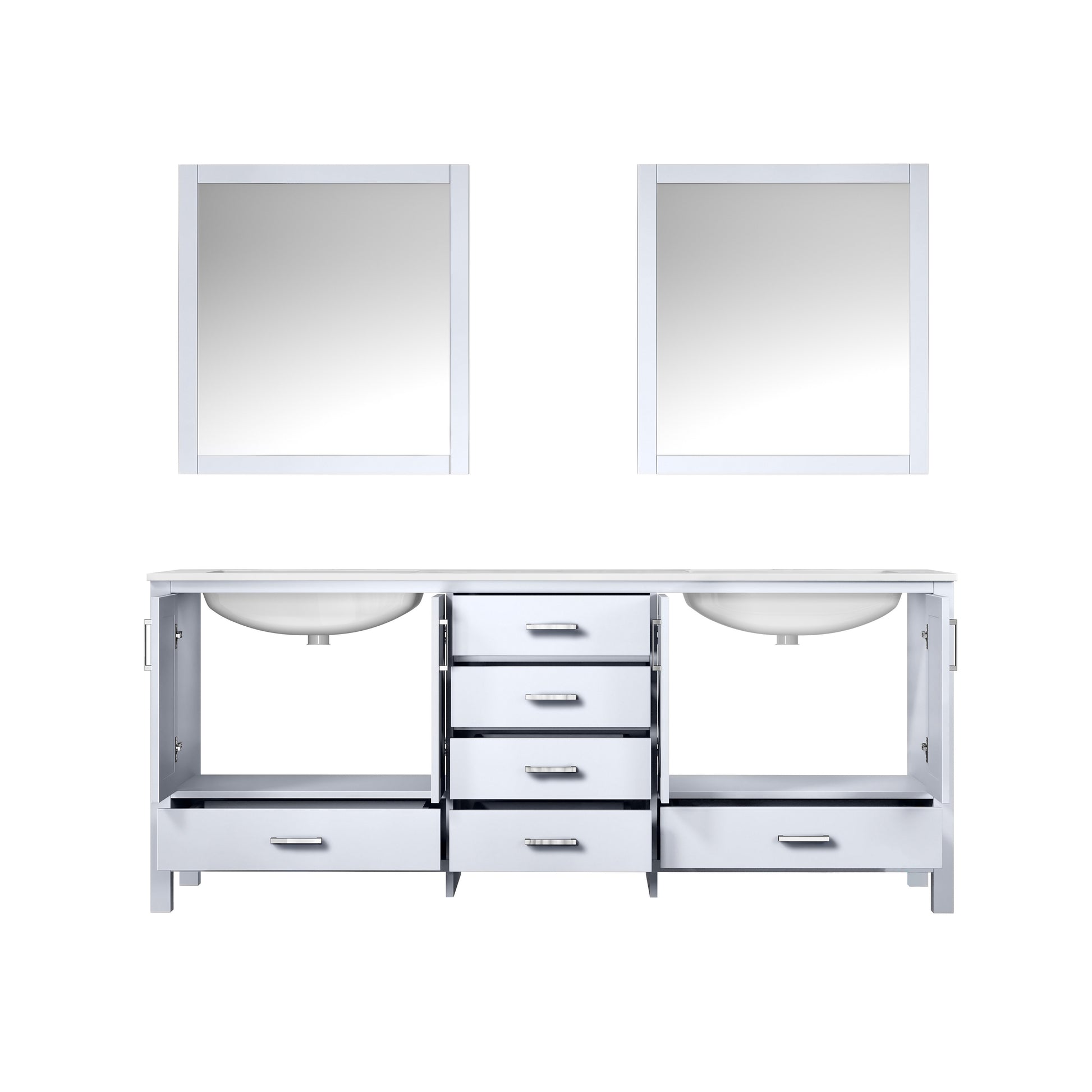 The Jacques vanity in white from Lexora provides a beautiful, contemporary style to any bathroom. With sleek, clean lines and a cool, neutral finish, this vanity's beauty is only matched by its seamless functionality. The cabinet doors and drawers feature soft-close hinges and slides to increase safety and ensure you never have to hear a slamming cabinet again. With solid birch and rubber wood construction, this piece is as durable as it is stunning. The Jacques vanity also comes in different sizes and other finishes to fit into any size bathroom and blends with any style. Every vanity also includes a matching stone countertop, mirrors with matching wood frame and ceramic undermount sinks, making it the one package you need to finish off your bathroom upgrade.