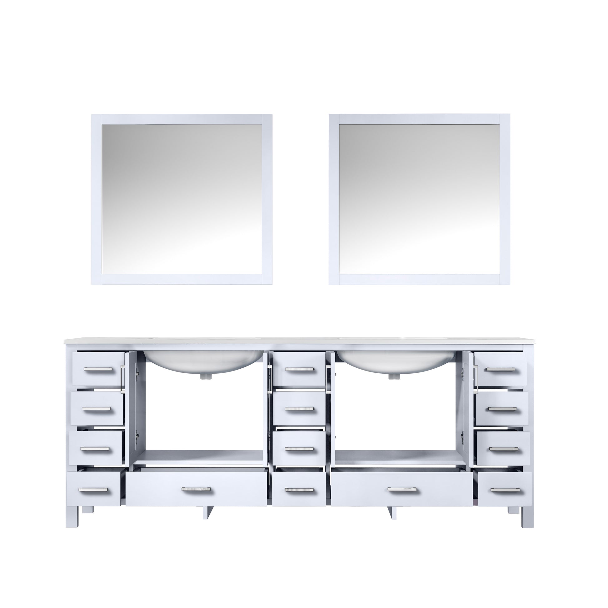 The Jacques vanity in white from Lexora provides a beautiful, contemporary style to any bathroom. With sleek, clean lines and a cool, neutral finish, this vanity's beauty is only matched by its seamless functionality. The cabinet doors and drawers feature soft-close hinges and slides to increase safety and ensure you never have to hear a slamming cabinet again. With solid birch and rubber wood construction, this piece is as durable as it is stunning. The Jacques vanity also comes in different sizes and other finishes to fit into any size bathroom and blends with any style. Every vanity also includes a matching stone countertop, mirrors with matching wood frame and ceramic undermount sinks, making it the one package you need to finish off your bathroom upgrade.