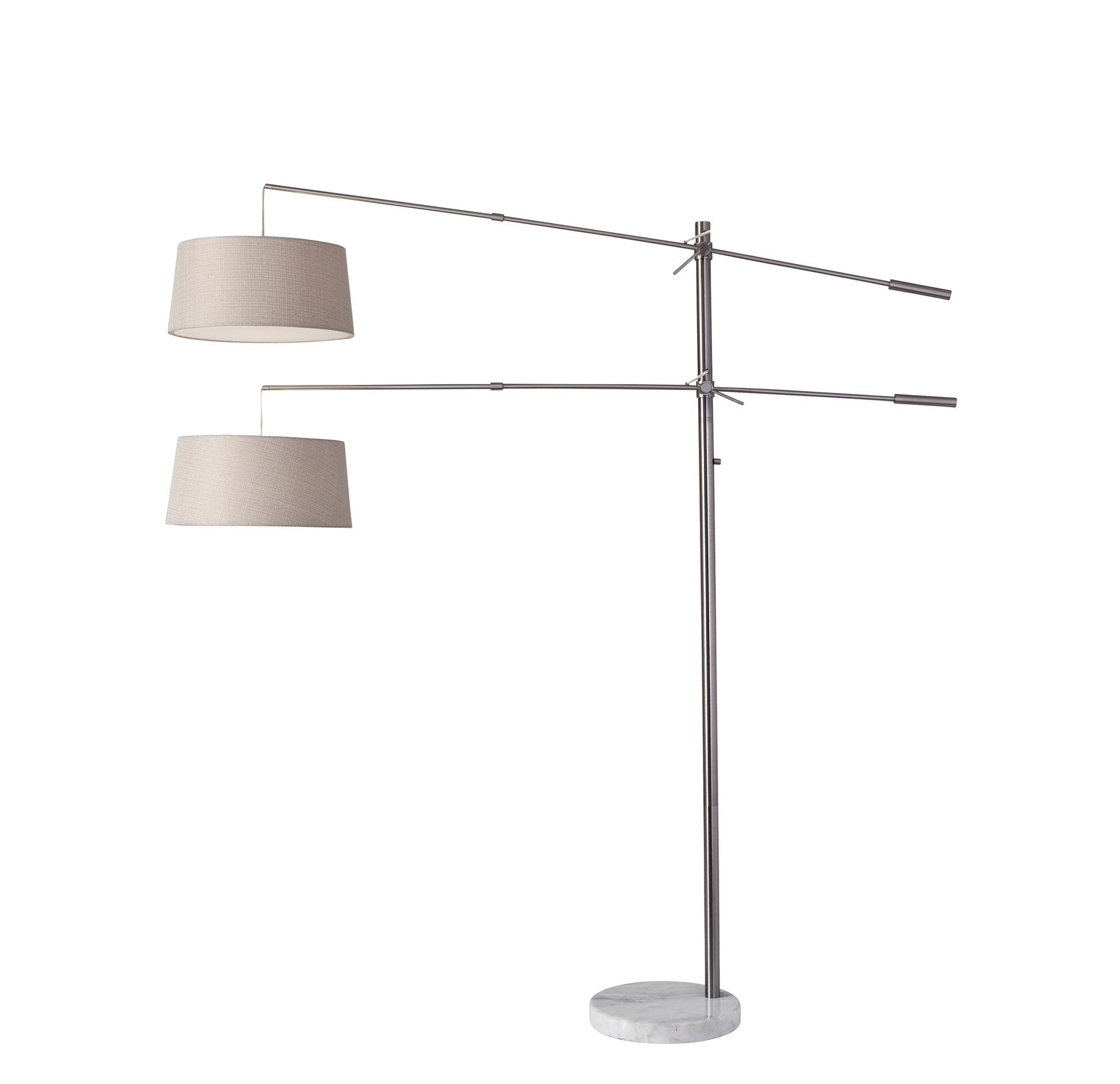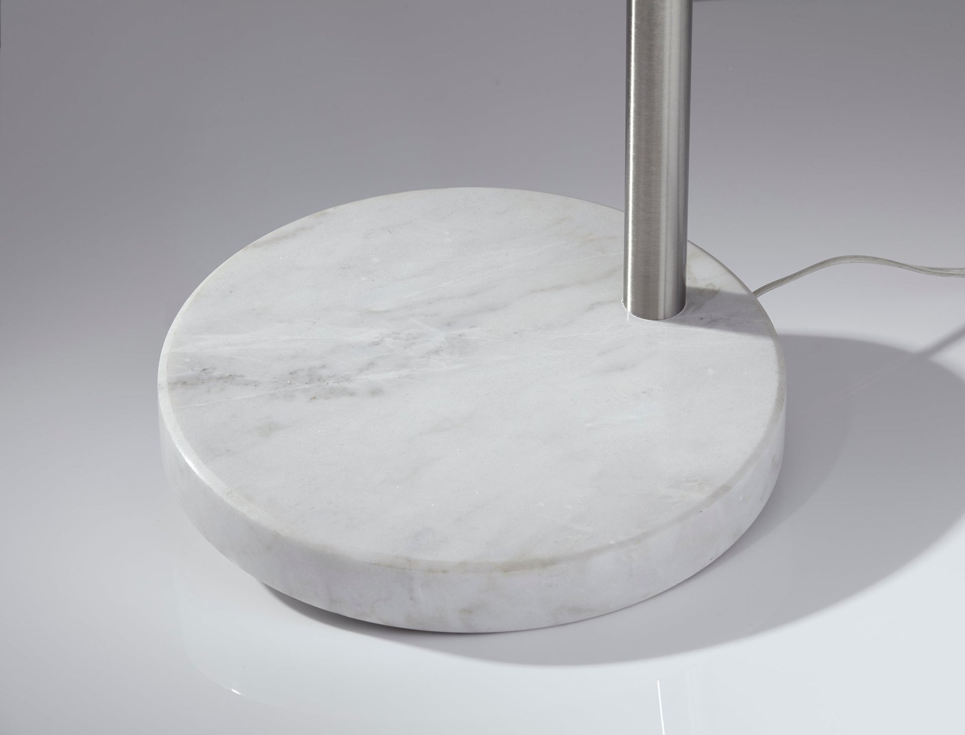 An instant solution for overhead lighting, the Manhattan 2-Arm Arc Floor Lamp provides not one, but two shades reaching up and out over a room to provide even and bright ambient lighting. With two extra long arms that adjust up/down and left/right, this Arc Lamp has the capability to spread light exactly where it is needed in your living room. A 14.5" round, chunky white marble base keeps this stately lamp sturdy. A brushed steel finish paired with textured beige fabric shades offers versatility into many types of décor. The shorter, wider tapered drum shades suspended from white fabric covered cords reveal a hint of modern influence. Two clean, white diffusers on the bottom of each shade to cast a uniform light around the room. Adjust the light to suit your needs with 3 different light settings. The 4-way switch located on the pole switches the light as follows: 1 shade on, other shade on, both shades on, all off.