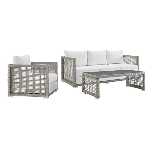 Modway Aura Outdoor Patio Wicker Rattan Sofa, Armchair and Coffee Table in Gray White