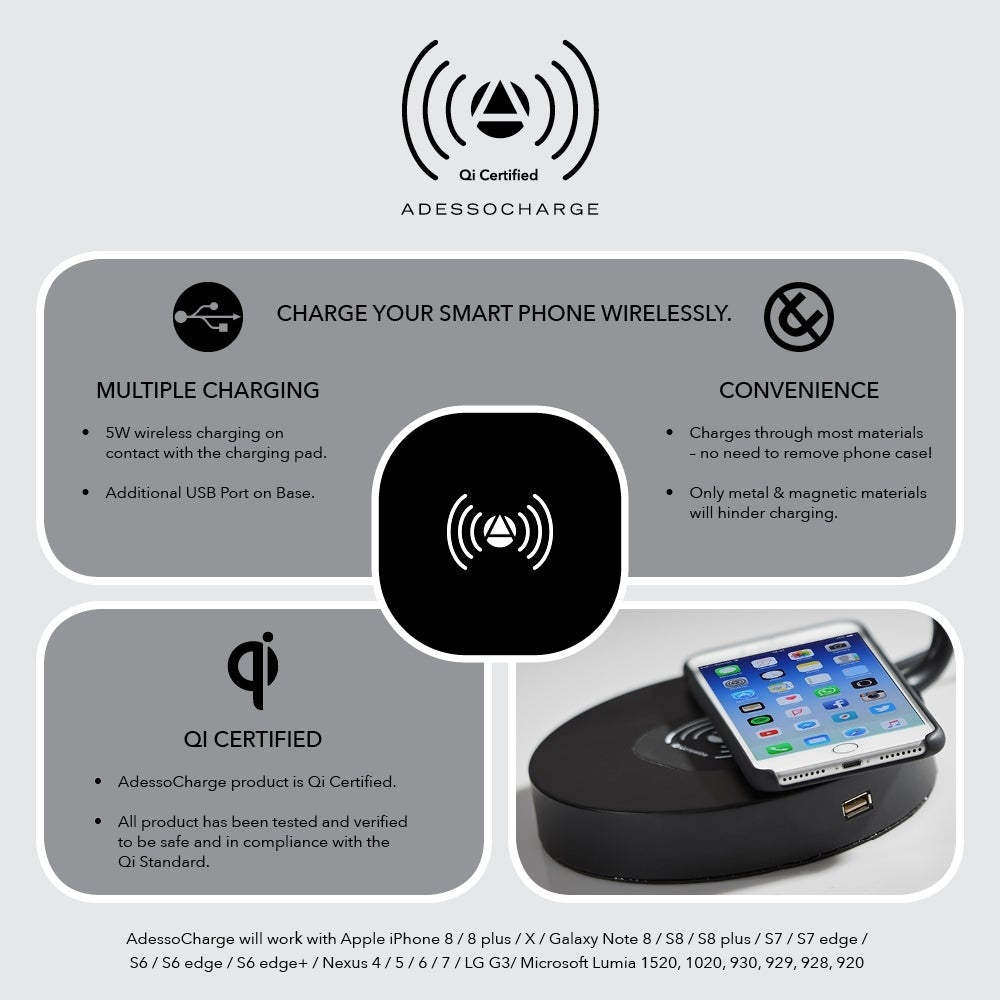 An essential addition to your workspace, the Oliver AdessoCharge Task Shelf Floor Lamp includes a wireless charging pad with Qi inductive charging technology. A matte black finish is mixed with walnut wood for mid-century modern appeal. Adjust the shade to direct the light where it is needed. A 12.25 round shelf holds the wireless charging pad and can also be used for extra storage needs. Many smartphones (list below) have Qi technology built in, so just place your phone on the pad and it will charge right up. No cords, no mess. It's that easy! All AdessoCharge product is Qi certified by the Wireless Power Consortium. AdessoCharge is unique in that you can use the AdessoCharge pad, the USB and the light all at the same time with maximum efficiency of all three. An easily accessible rocker switch on the shelf turns the lamp on and off. Just plug in the lamp and the charger will work. This wireless charging pad will charge your phone through most materials, do you do not even need to remove your case! Only metal will hinder the function of the charging pad to charge through the case. If your smartphone doesn't support Qi wireless charging, you will need to purchase a Qi compatible case, which is sold through a variety of retail channels. Or you can also charge your smartphone with the USB port that is also included in the lamp base. Compatible with Apple iPhone 8 / 8 plus / X / Galaxy Note 8 / S8 / S8 plus / S7 / S7 edge / S6 / S6 edge / S6 edge+ / Nexus 4 / 5 / 6 / 7 / LG G3/ Microsoft Lumia 1520, 1020, 930, 929, 928, 920