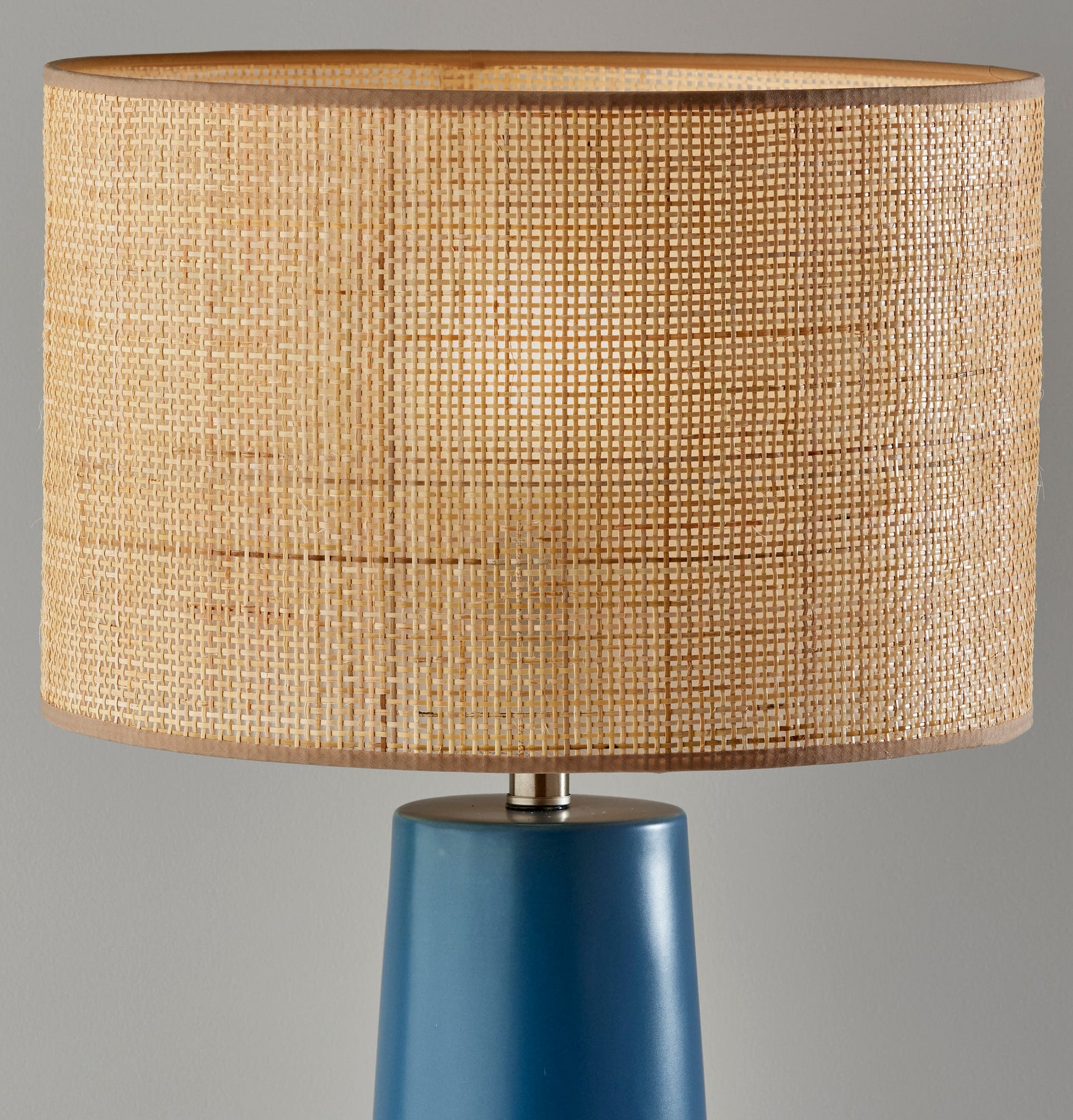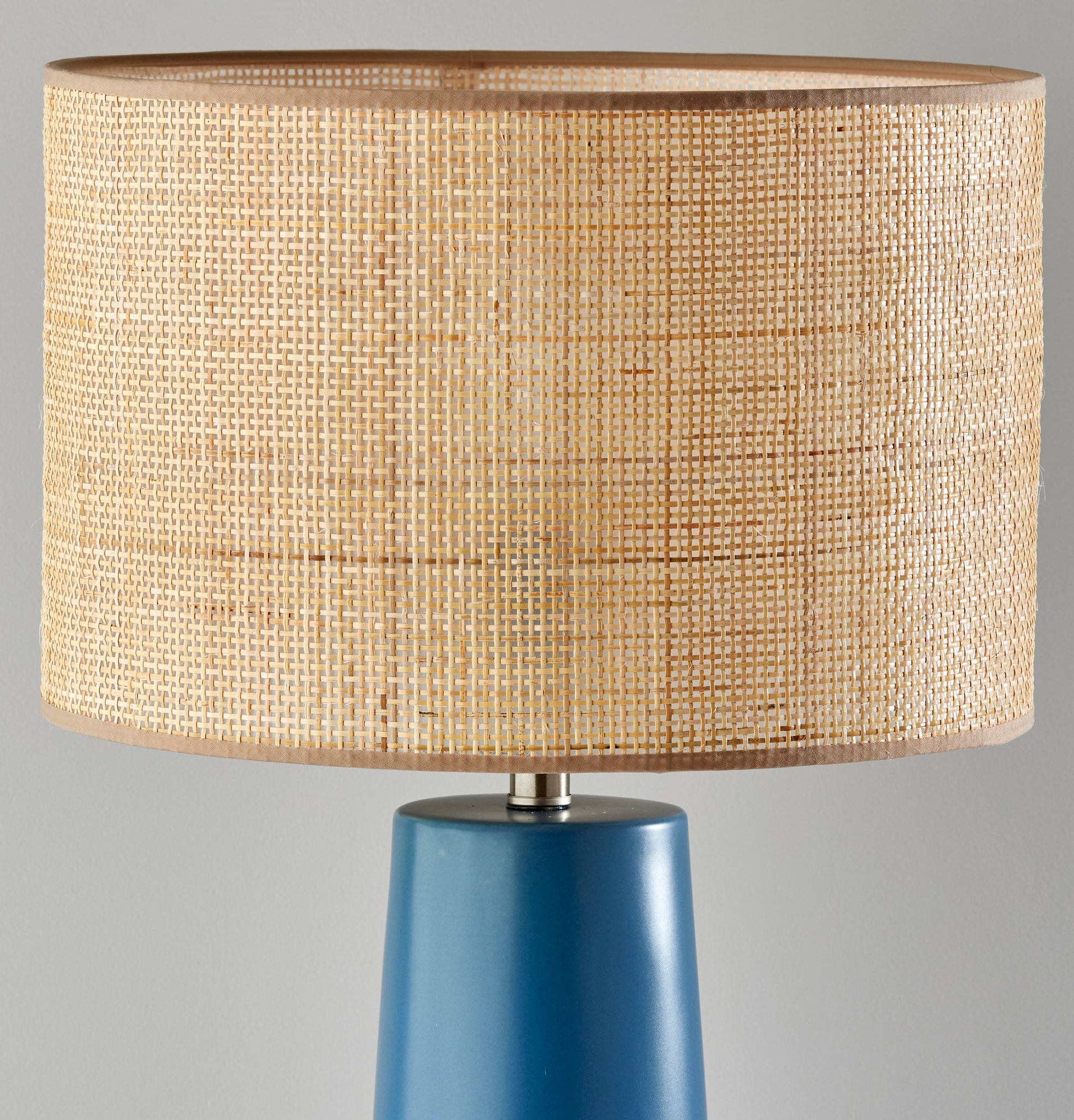 Defined by clean lines and its rich color, the Sheffield tall table lamp blends in seamlessly with farmhouse, contemporary, or coastal décor. An 18" tall cylindrical and gently tapering base crafted of cornflower blue ceramic is topped by a woven natural rattan shade. The lamp shade softly disperses the light from a 150W bulb and is trimmed with beige fabric along the top and bottom to complement the blue base. For versatile lighting options, a 3-way rotary socket switch easily adjusts the brightness between low, medium, high, and off. The Sheffield tall table lamp is also available with a black ceramic base for a contrasting look or with a monochrome white ceramic base.