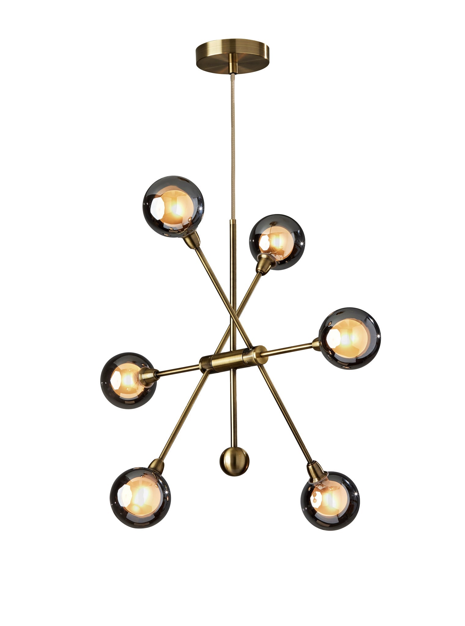 Add a fun and unique addition to entryways, kitchens, dining areas, and more with the Starling LED 6 light chandelier. The antique brass finish on this 24" tall chandelier contrasts beautifully with the 4" diameter Sputnik-style shades. Made of double-layer glass, the 6 shades are frosted on the inside but smoked on the outside for a unique look, while the included 3W LED bulbs are dimmable so you can easily adjust the lighting level. For added versatility, the angle of the light stems is adjustable, allowing you to create a look all your own. The antique brass stem leads to a matching 5" diameter base, and the chandelier features a 72" gold fabric cord, allowing you to adjust the light's height to suit the needs of any room regardless of the ceiling height.